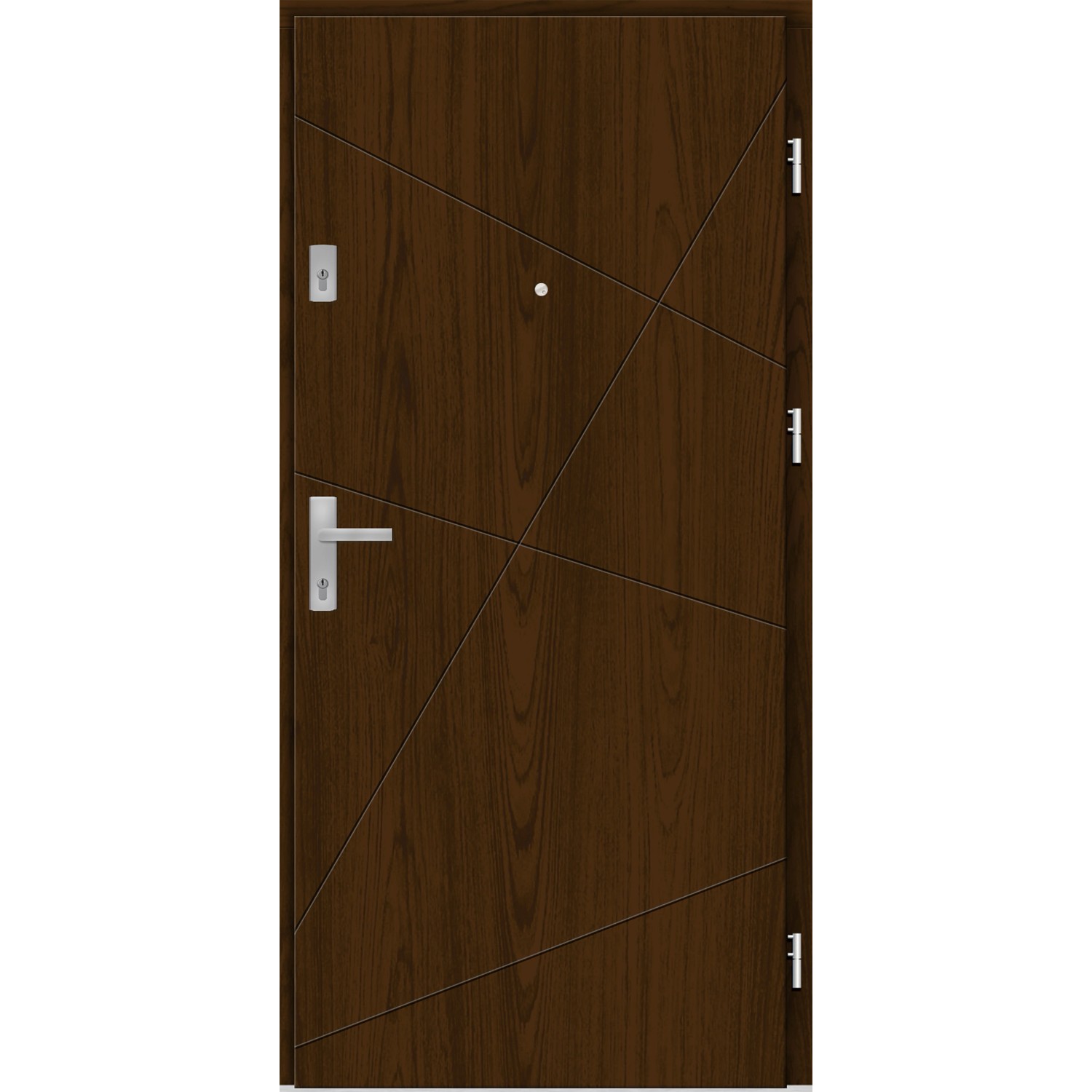 • Zestaw zawiera klamkę, szyld, wizjer, wkładki srebrne, ościeżnicę, próg, 2 zamki trójbolcowe, regulowany zaczep zamka, zawiasy regulowane w 3 płaszczyznach