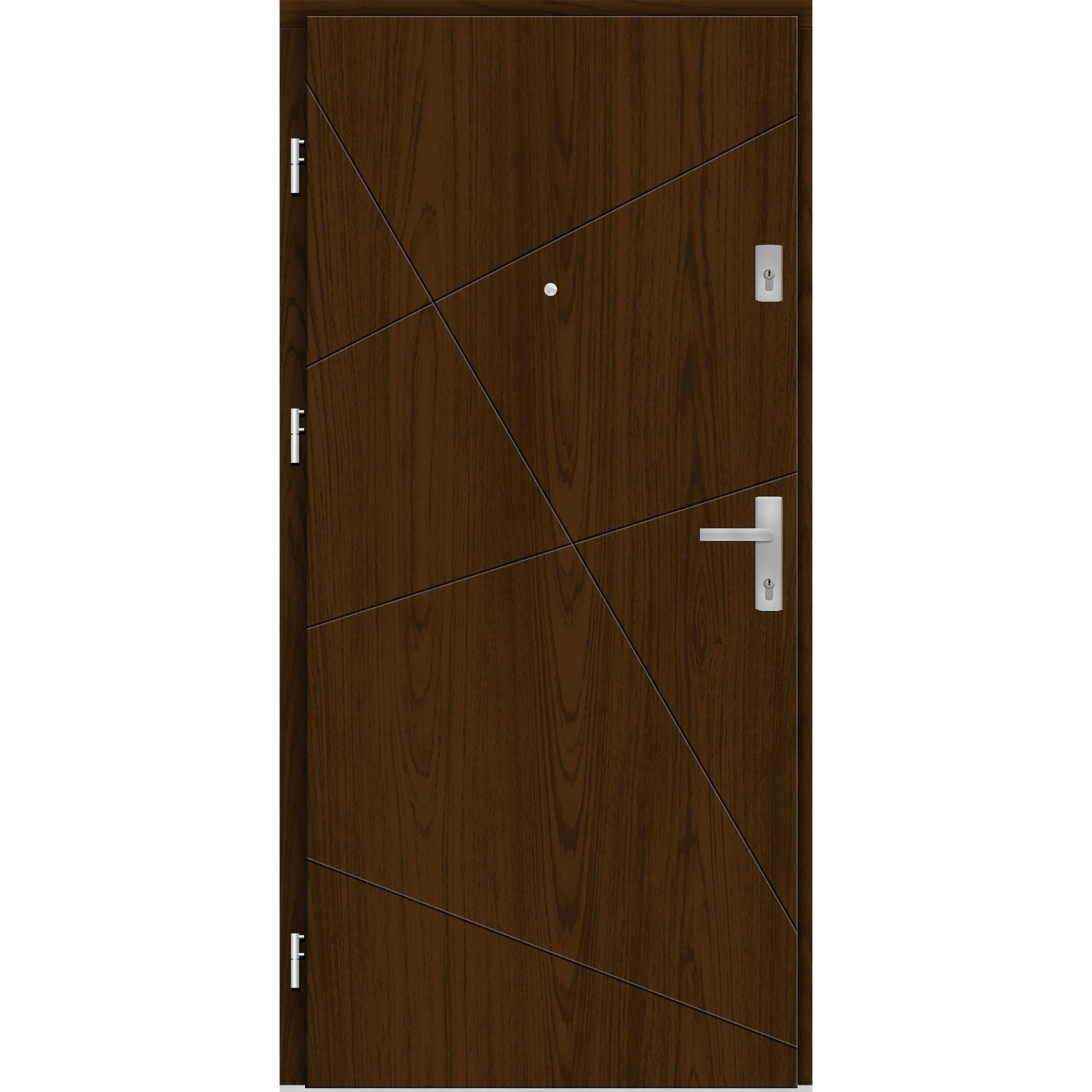 - Zestaw zawiera klamkę, szyld, wizjer, wkładki srebrne, ościeżnicę, próg, 2 zamki trójbolcowe, regulowany zaczep zamka, zawiasy regulowane w 3 płaszczyznach